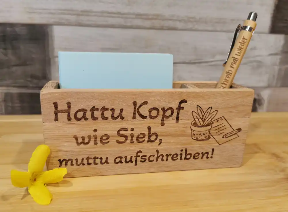 Material: Holz Maße: L: 16cm - H: 7cm - T: 4cm Gravur: " Hattu Kopp wie Sieb , Muttu aufschreiben "